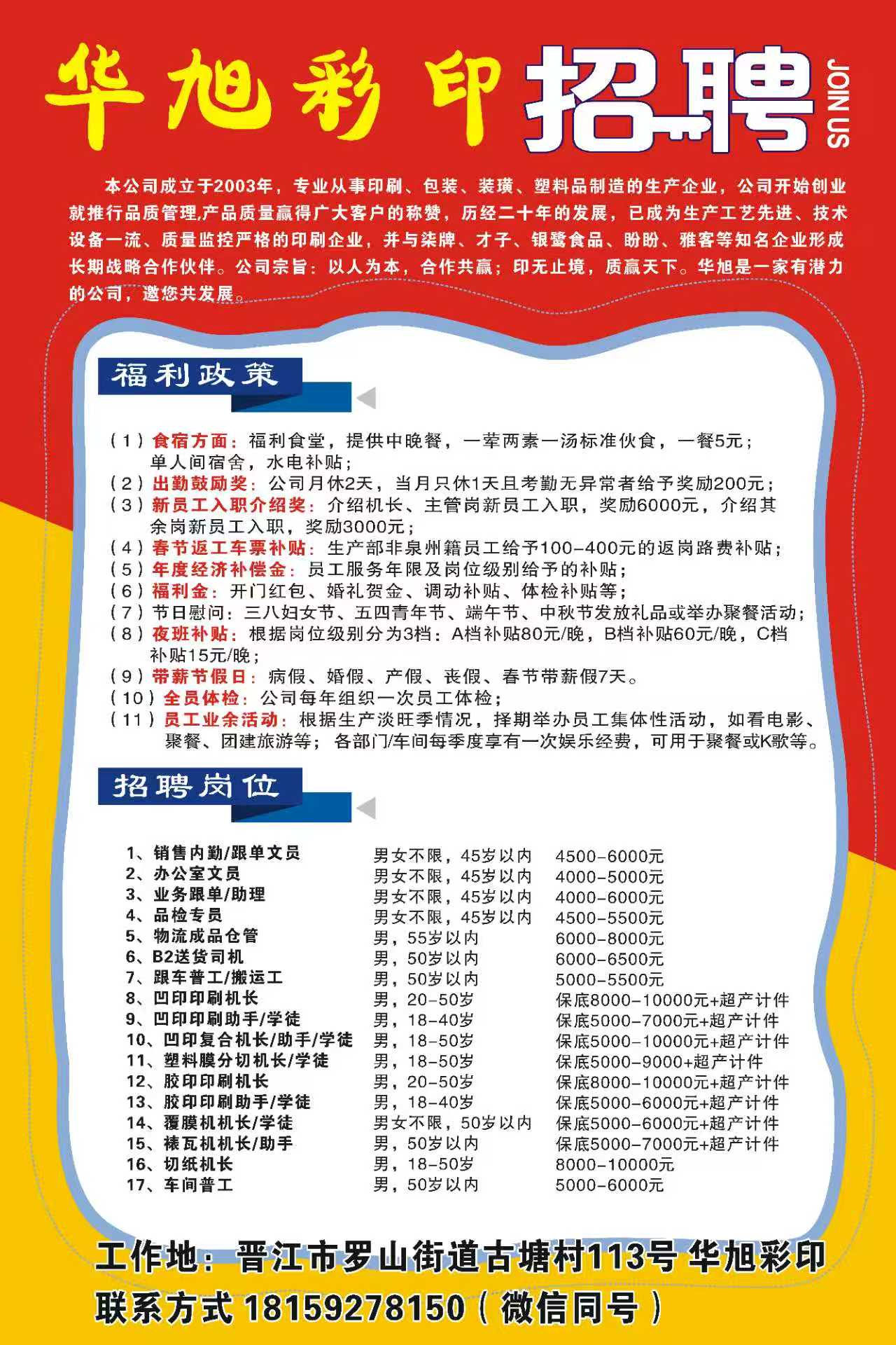 福建省晋江市华旭彩印有限公司2026最新招聘信息